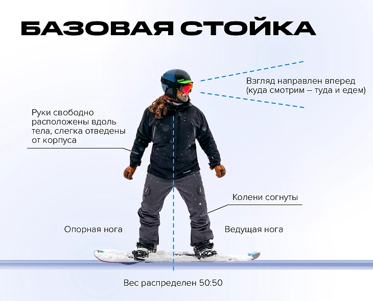 Правильное положение, когда вы стоите на сноуборде: плечи – вдоль линии сноуборда, ноги чуть согнуты в коленях, вес – примерно посередине доски. Если стоите на склоне – смотрите прямо перед собой, если едете – взгляд направлен в сторону движения. Нагрузку распределяем в соотношении 50:50 на каждую ногу. Если вы стоите на наклонной поверхности и начнете переносить вес на ведущую ногу, то начнете скатываться.