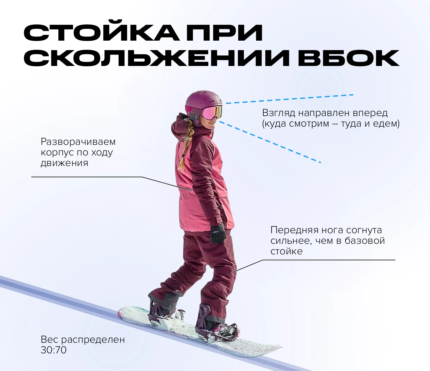 Для скольжения вбок нужно сильнее задавить пятку той ноги, что находится по направлению движения, не важно – опорная она или ведущая. Если надавить на пятку правой ноги, сноуборд поедет в правую сторону. Если перенести вес на левую ногу, доска поедет влево. Со стороны выполнение этого упражнения выглядит как падение листа с дерева.