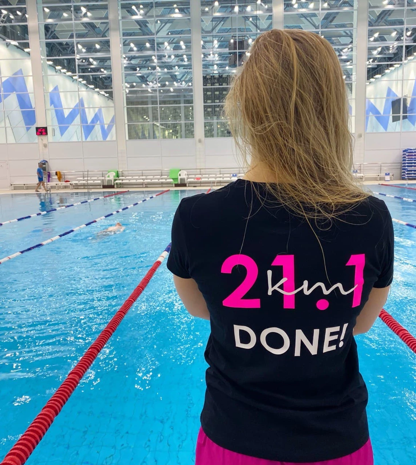 Есть ещё призовое место в плавании на время, 60 минут. Заняла третье место в Кубке Чемпионов по плаванию среди любителей. Сюда же в достижения запишем и заплыв на 26 километров. Есть два больших заплыва в моей жизни. Один — в бассейне, ультрамарафон на 21 километр. Второй — в открытой воде по Волге, ультрамарафон 26 километров.