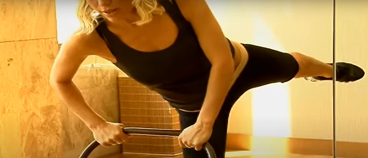 Вы должны почувствовать натяжение с внешней стороны бедра. Повторяйте до наступления усталости. Затем переходите ко второй ноге.