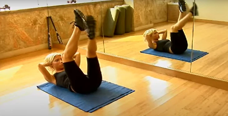 Займите положение лежа на коврике. Руки за головой, ноги прямые и скрещены одна на другую.