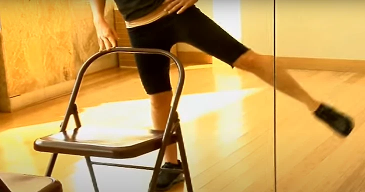 Исходное положение: необходимо встать за стул, опереться руками на спинку и отвести одну ногу назад.