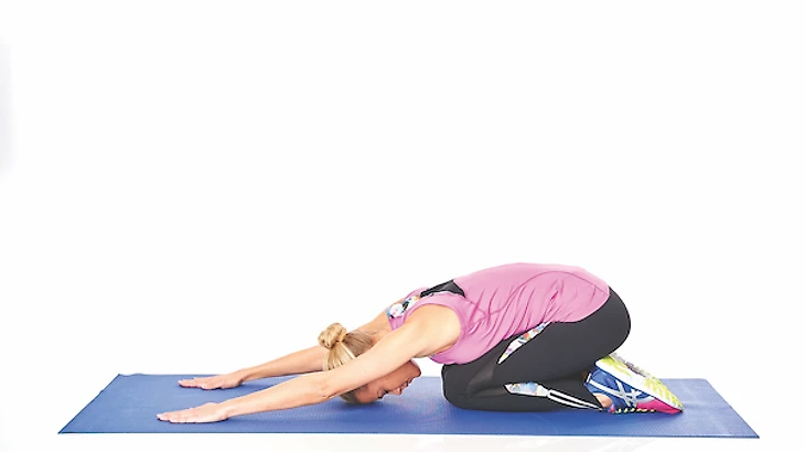 Встаньте на колени на пол и опустите ягодицы пока не коснетесь пяток. Вытяните руки вперед и коснитесь пола ладонями и лбом. Потянитесь вперед, почувствуйте растяжение в грудном отделе позвоночника.