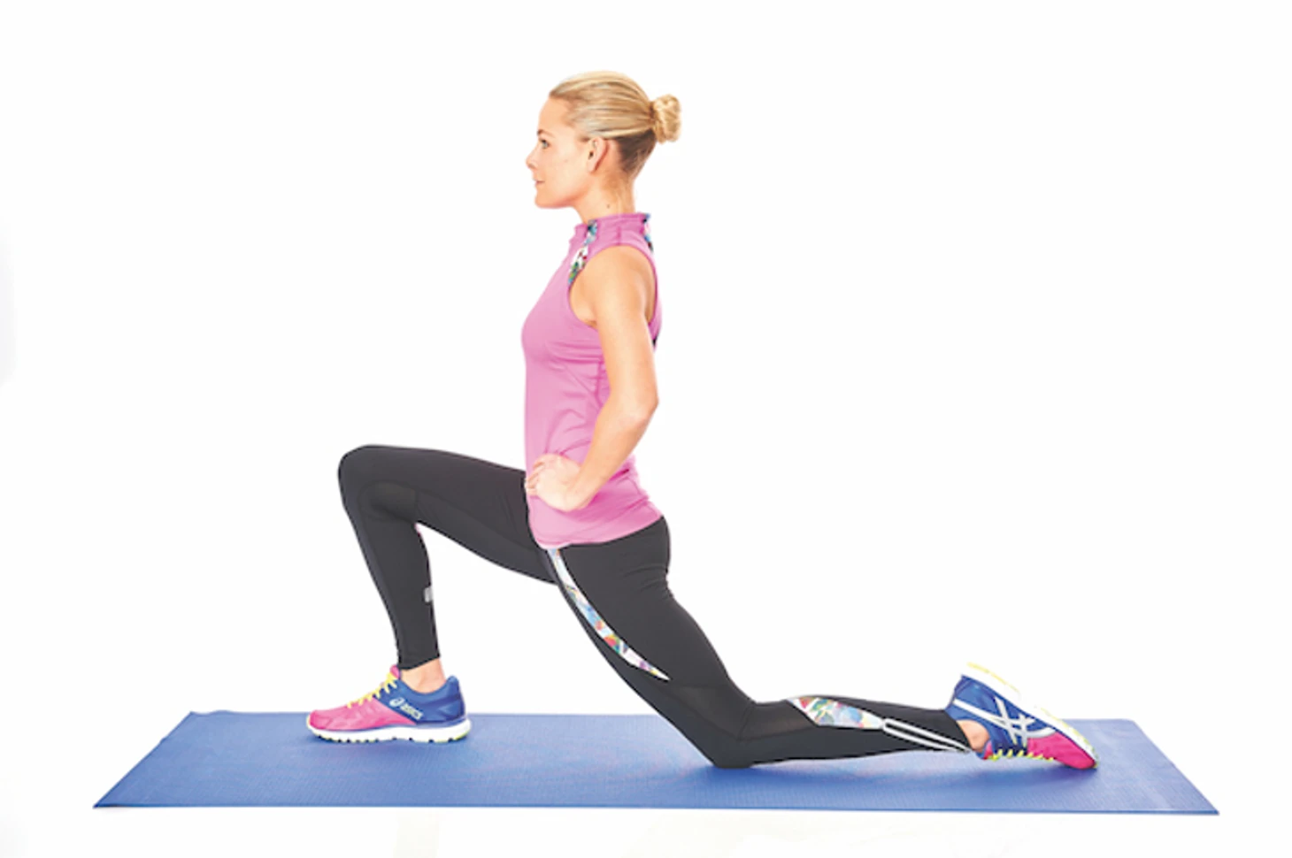 Сделайте выпад вперед правой ногой, левая касается коленом земли. Тянитесь вперед, пока не почувствуете растяжение правого бедра. Не наклоняйтесь, корпус прямой. Удерживайте положение. Повторите для другой ноги.