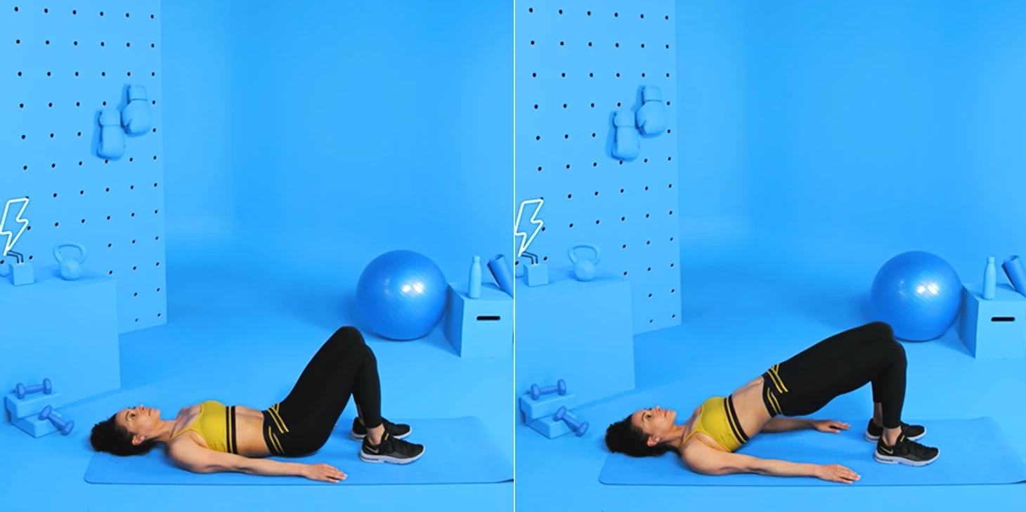 Надавите на пятки, напрягите ягодицы и медленно поднимите бедра вверх, пока тело не образует прямую линию от колен до плеч. Удерживайтесь в верхнем положении пять секунд, затем вернитесь в исходное. Это одно повторение.