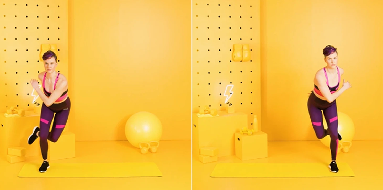 Отведите левую ногу назад, выполняя обратный выпад, при этом нога заводится чуть глубже вправо, чтобы получился реверанс. Оба колена должны образовать угол в 90°. Вернитесь в исходное положение. Теперь сделайте аналогичный выпад правой ногой. Это одно повторение.