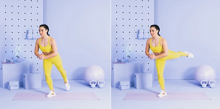 Сохраняя вес тела на правой ноге, начинайте медленно отводить левую ногу назад. Она должна достигнуть положения параллельно полу. Медленно вернитесь в исходную позицию.