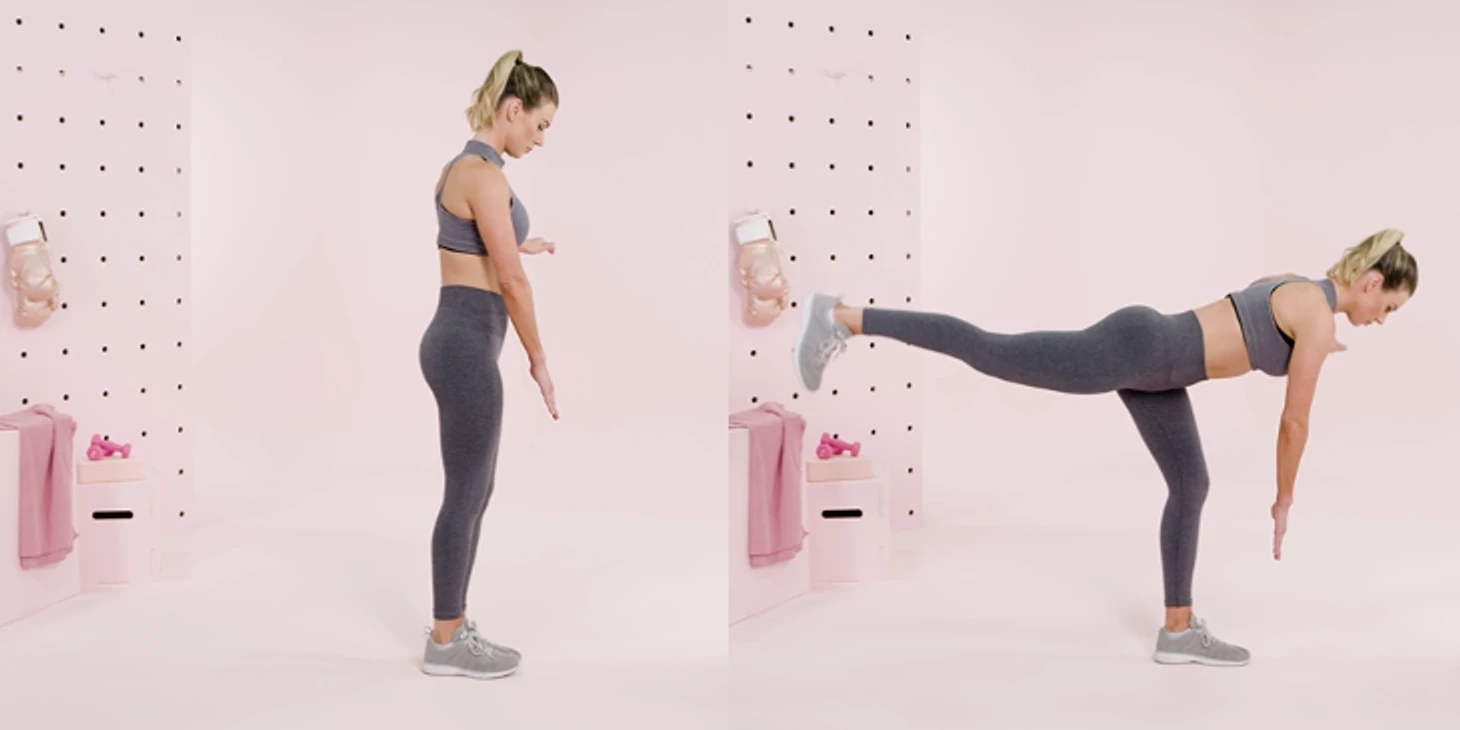 Напрягите пресс и начинайте медленно наклоняться вперед, отводя выпрямленную правую ногу назад. Наклоняйтесь, пока корпус и правая нога не образуют прямую линию, параллельную полу. Затем медленно вернитесь в исходное положение.