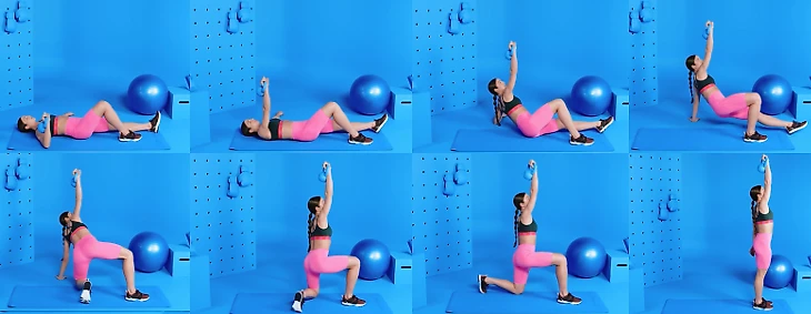 Теперь начинайте плавно подниматься – упритесь правой рукой в пол и сядьте. Затем вытолкнитесь вверх, оторвите бедра от пола. Левая рука с гирей постоянно направлена вверх. Осторожно вернитесь в исходное положение. Это одно повторение.