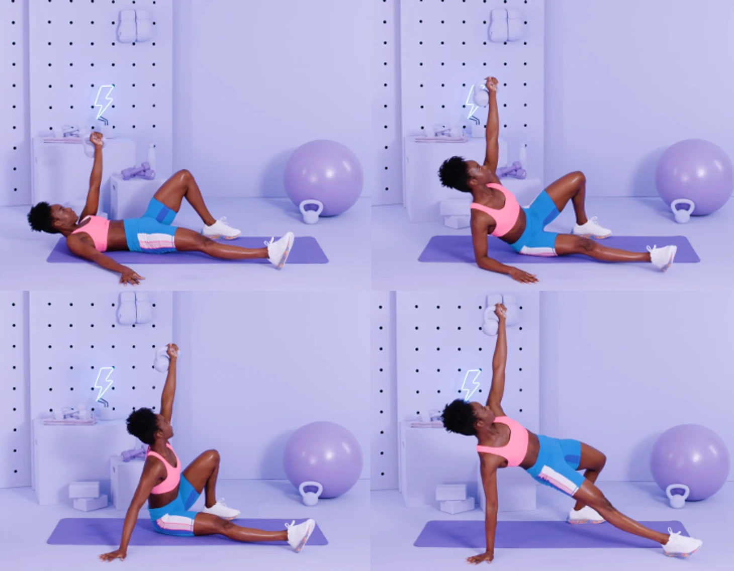 Лягте на коврик. Правая рука и нога располагаются под углом 45° к телу, левая нога согнута в колене. Возьмите в левую руку гирю и вытолкните вертикально вверх.
