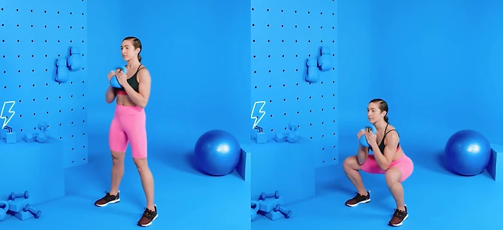 Сделайте присед. Во время вставания разверните ладони и выжмите гири над головой. Корпус удерживайте прямым, не раскачивайтесь. Опустите гири к груди, чтобы принять исходное положение. Это одно повторение.