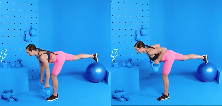 Перенесите вес тела на левую ногу и отведите прямую правую ногу назад, опуская туловище вниз. Остановитесь, когда корпус и правая нога станут параллельны полу. Из этого положения начинайте тянуть гири вверх, сводя лопатки. Затем повторите все движения в обратную сторону и вернитесь в исходное положение. Это одно повторение.