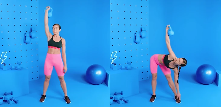 Поверните голову вправо, посмотрите на гирю и начинайте медленно опускаться к полу через левую сторону, пока не коснетесь левой ступни пальцами левой руки. При правая рука остается прямой. Немного задержитесь в нижней точке и затем вернитесь в исходное положение. Это одно повторение.