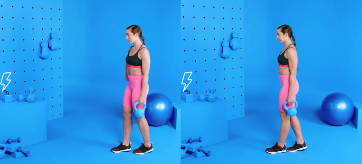 Встаньте прямо, ноги вместе, гиря в левой руке и прижата к боку. Правая рука на бедре. Напрягите пресс и сделайте небольшой шаг вперед. Продолжайте идти, пока не сделаете 15 шагов. Затем повторите, удерживая гирю в другой руке.