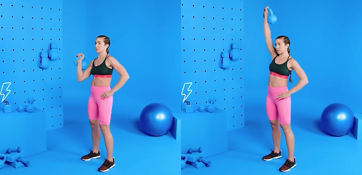 Одним движением разверните ладони и выжмите гири над головой, пока руки не станут прямыми. Вернитесь в исходное положение. Это одно повторение.