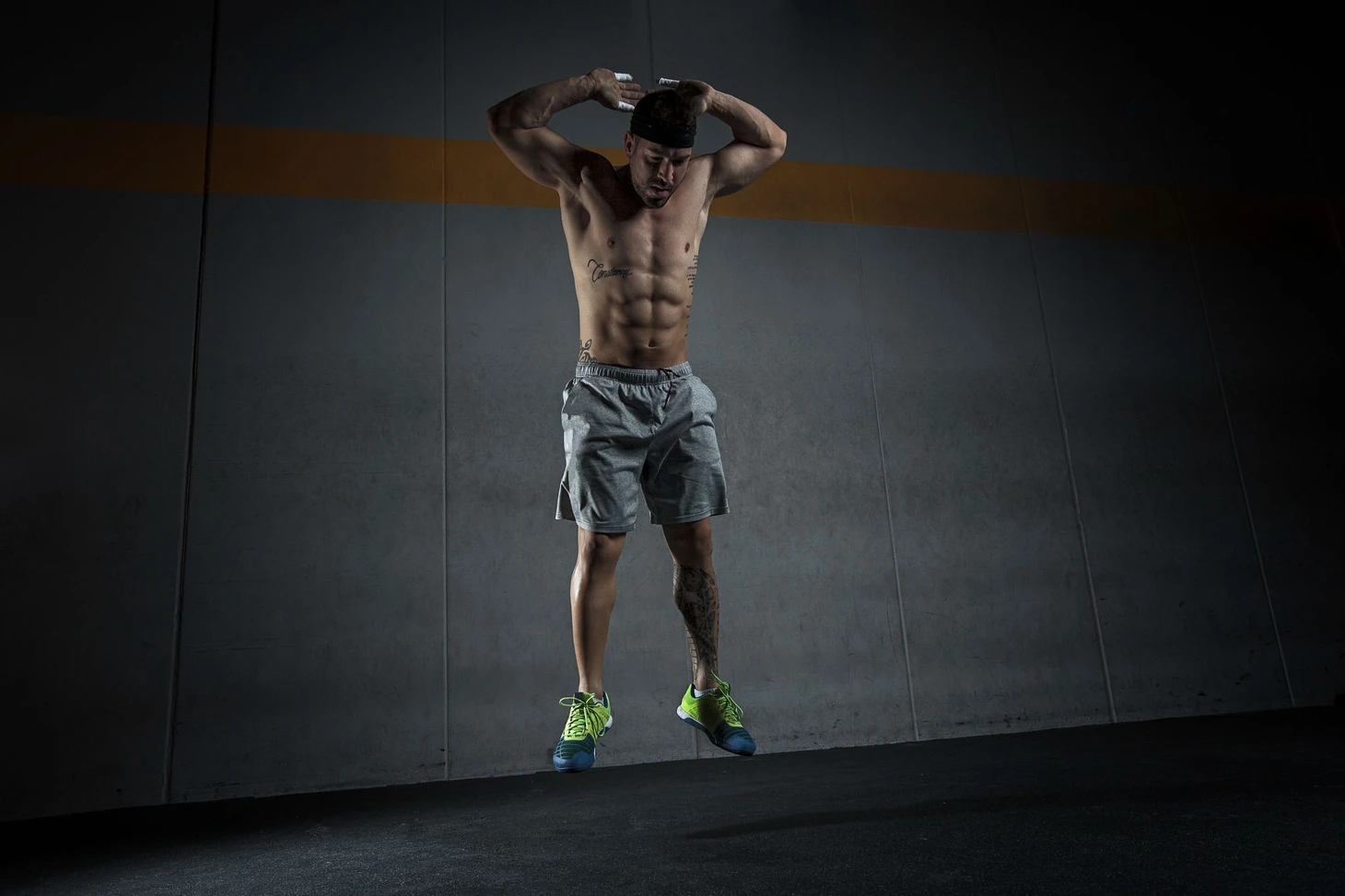 Резким движением выпрыгните вверх, поднимая руки, стараясь насколько возможно потянуться ими к потолку.