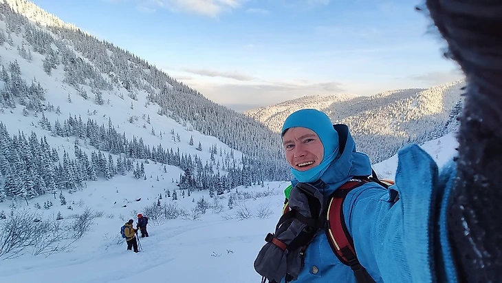 С каждым шагом удаляясь от базы, понимаешь, что уходишь в дикую природу. Ощущаешь себя полностью изолированным от цивилизации. И вот ты уже поднимаешься в гору, рядом с тобой 5 человек и больше ничего. Нет сотовой связи, нет интернета. Останавливаешься и слышишь тишину, максимум – снег падает с деревьев. Идешь наверх, где-то вдалеке виднеется Байкал, с другой стороны – горные пики.