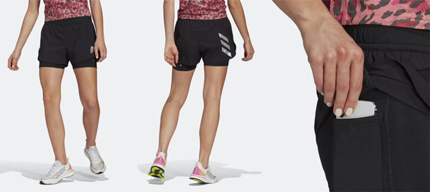 Беговые шорты с внутренними леггинсами – для тех, кому не нравятся вид обтягивающих шорт-спринтеров. На внутренних леггинсах с наружной части бедра расположен карман для телефона (удобное расположение, там он прижат к бедру и не трясется). Шорты на завязках – всегда можно затянуть, чтобы не спадали. Это хорошо, потому что модели, где есть только резинка на поясе, часто не очень хорошо держатся. В этой модели также использовано волокно Primeblue из переработанного пластика.