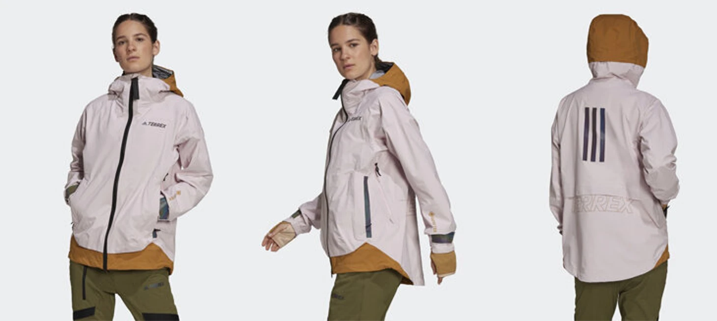 Terrex – серия одежды и обуви для трейлраннинга и хайкинга. В этом дождевике защита – мембрана Gore-Tex, которая отводит пар, когда вы потеете, но не пропускает влагу снаружи. Из важных деталей: компактно складывается, есть внутренний карман на замке, вентиляционные вставки (замки на подмышках), манжеты на липучках. Хороша по дизайну и цвету (пыльно-розовый с песочными вставками), единственный минус – слишком спортивный вид; если захотите носить в повседневной жизни, придется стилизовать.