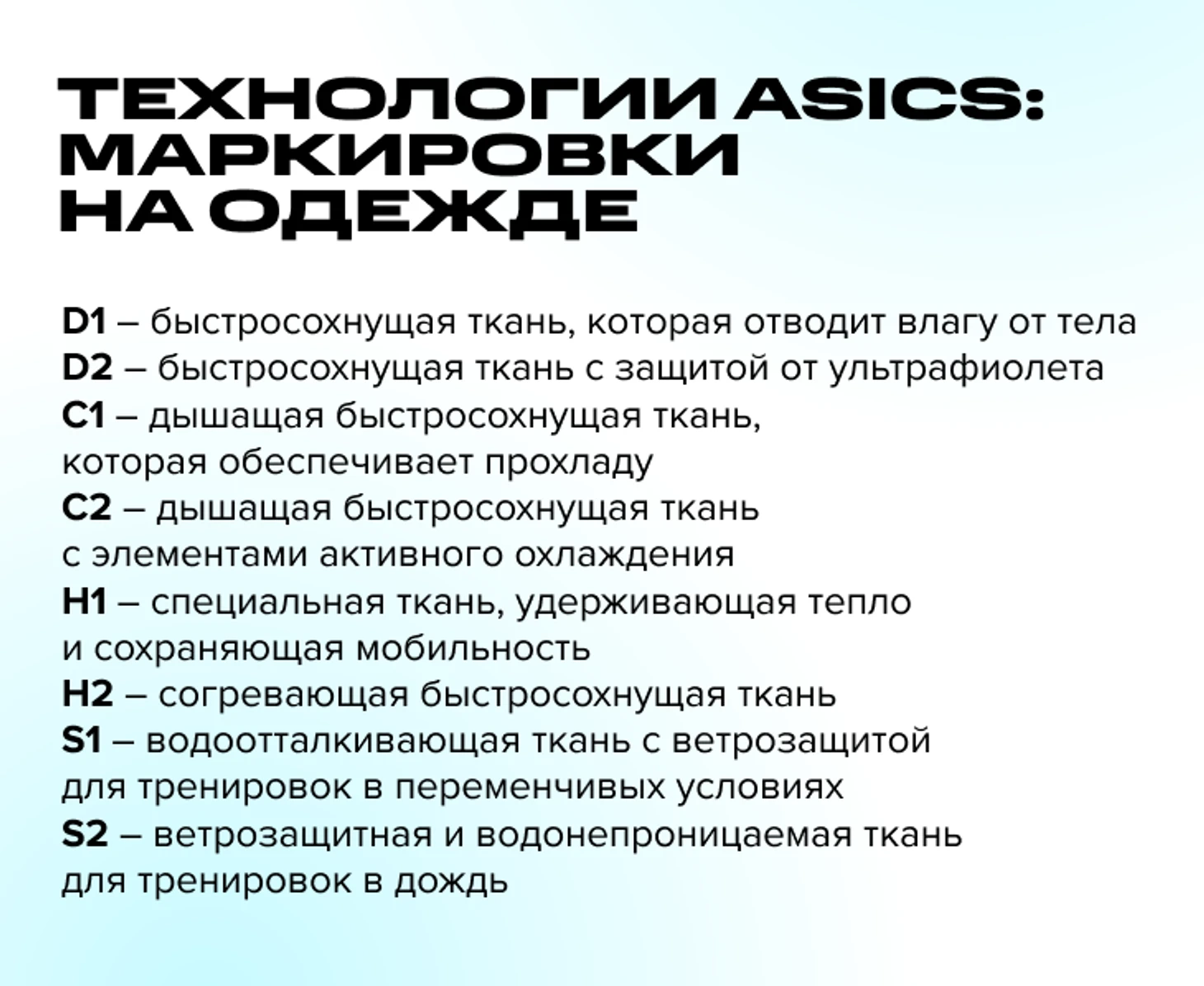 Вторым слоем идет лонгслив или флисовая кофта, тут по личным предпочтениям. Я использую лонгслив от ASICS с маркировкой H1 или «heating»: это означает, что вещь более теплая, чем традиционная одежда. Существуют другие маркировки: C1/C2 или «cooling», то есть легкая дышащая ткань; S1/S2 – с ветро- и влагозащитой. Обязательно читайте описание товара и этикетки, чтобы подбирать более подходящую для конкретных условий одежду.