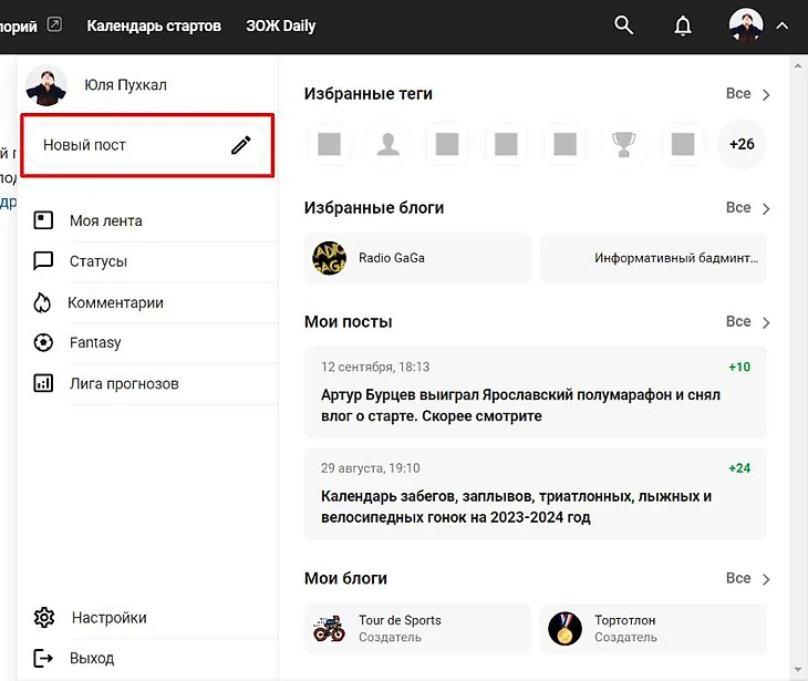 Любой зарегистрированный пользователь может опубликовать пост, где поделится тем, что у него накипело в контексте спорта. Это может касаться как профессионального, так и любительского спорта.