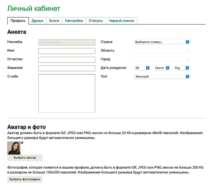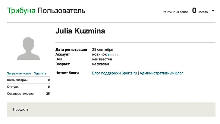После регистрации ваш профиль пуст: в нем нет фотографии, ваших интересов, любимых тегов. Вот как выглядит только что зарегистрированный профиль: