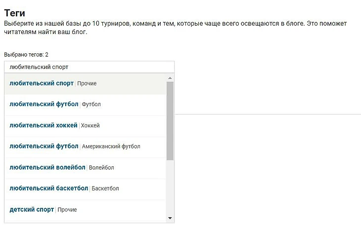 От того, какой вид спорта вы выберете при создании блога, зависит, в каком разделе будут появляться ваши записи. Конечно, менять раздел можно будет и прямо во время публикации каждой отдельной записи – вас никто не ограничивает. Но рекомендуем указать главный раздел – в будущем все ваши записи будут появляться в списке новых постов всей Трибуны и в списке обновлений раздела.