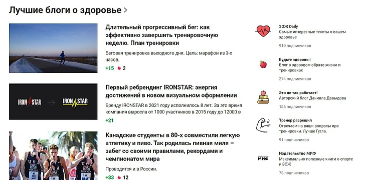 Лучшие посты в блогах из раздела «Здоровье» отображаются на главной странице раздела. Если вы поставите привязку блога или отдельного поста к «Здоровью» (то есть выберете его как вид спорта для блога или записи), то увидите свой пост на странице раздела в этом блоке.