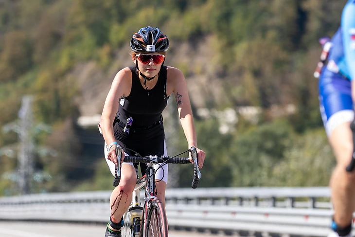 Тренировки каждый день на износ, 24/7 смены в кофейне, вся зарплата на гидрокостюм и велосипед. Три месяца упорной борьбы с самой собой. Да, были слёзы, что не получается плавать. Да, были слёзы, что не получается ехать в велотуфлях. Да, были слёзы, что ноги не бегут после велосипеда. Но желание было сильнее всего этого. И вот я уже мчу на велосипеде по трассе до Розы Хутор, но все в один момент переменилось, в глазах темно, я лежу на трассе, 20км… цепь сорвана, руль вогнут, все в крови. Адреналин бьет в голову, вправляю силой руль, надеваю цепь, не заметив, что вылетела еда, я прыгаю на велосипед и еду дальше, только потом заметила, как тяжелеет чип из-за крови, но при виде фотографа пытаюсь улыбаться, так как все лето мечтала о фотографии на этой трассе. И вот уже заветный разворот, потом транзитка, я бегу.