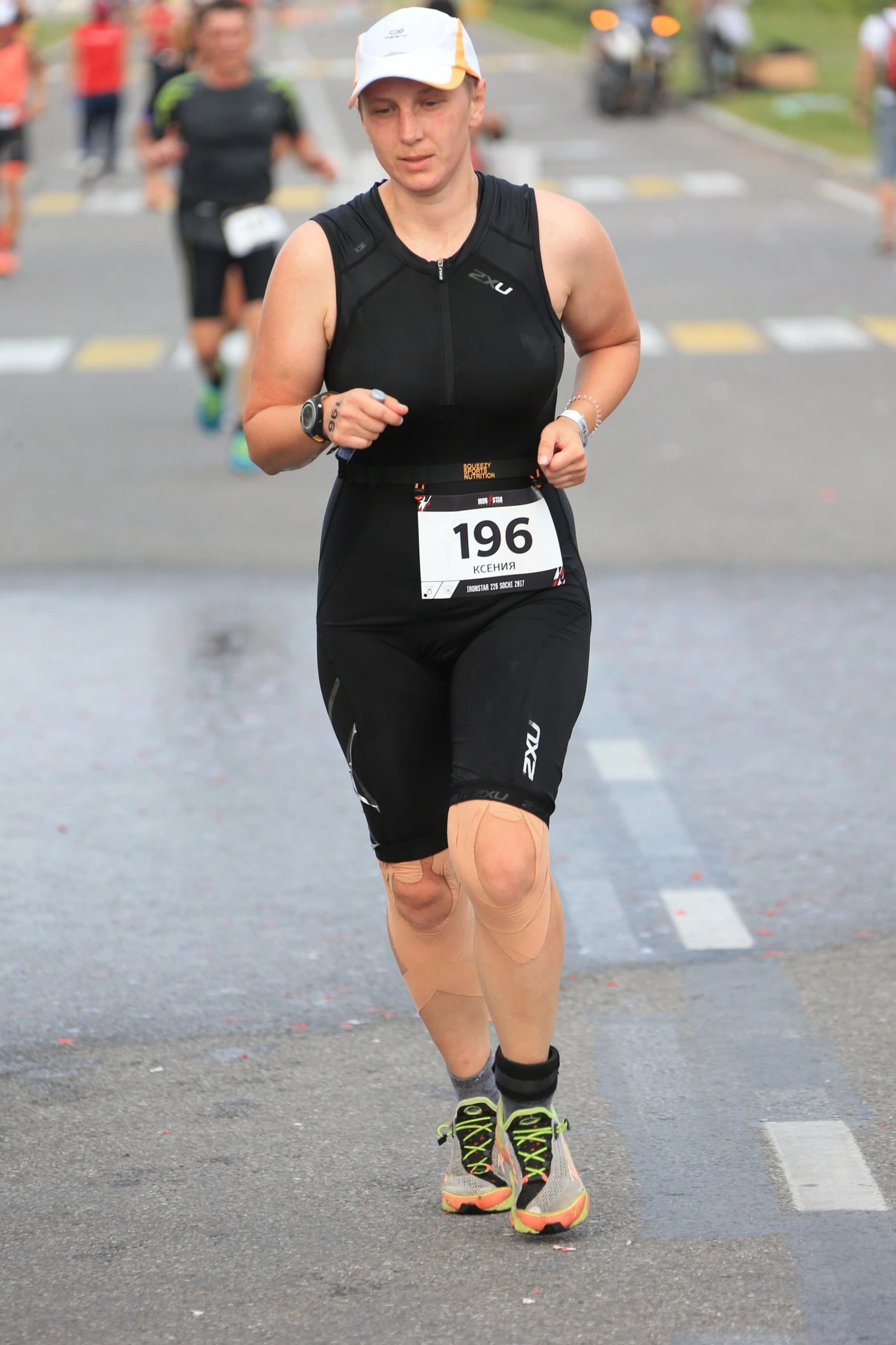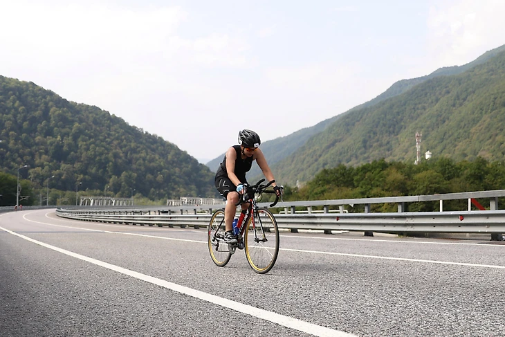 После полутора часов настало время велоэтапа. 180 км ветра, солнца и гор. Если ты не знаешь, куда деть 6 часов днем в субботу в Сочи, то можно попытаться доехать до Красной Поляны и вернуться обратно два раза. Впечатлений будет масса! Первые 90 км были легкими и воздушными, как прохладное, но нежное утро в горах. Пики гор предавали эти километрам красоты, а перекрытое шоссе полностью давало шанс насладится звуками гор. Второй круг велоэтапа дался уже тяжелее, так как жара съедала дополнительно силы, но участники, которые ехали мимо все время старались найти слова поддержки и я крутила педали, напевая песню из мультика.