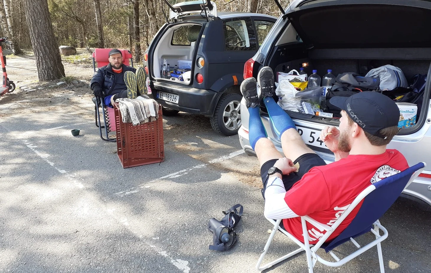 Большинство бегунов после очередной петли старается закинуть ноги повыше, чтобы снять отек. Кто-то использует массажный пистолет, а некоторые участники даже привозят с собой воздушно-компрессионные штаны, которые улучшают кровоток в уставших ногах.