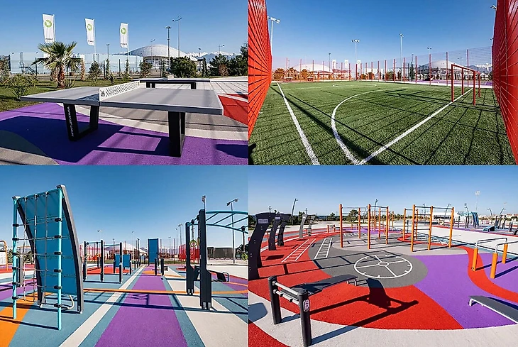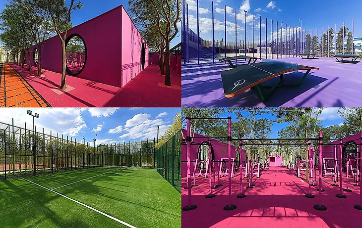 Зоны бесплатных тренировок: бежевая (пляжный волейбол), синяя (классический волейбол), фиолетовая (пляжный футбол, стритбол, текбол), розовая (воркаута и полосы препятствий). Зоны платных занятий: оранжевая (теннис), зеленая (паддл-теннис, падел и бадминтон), желтая (сквош).
