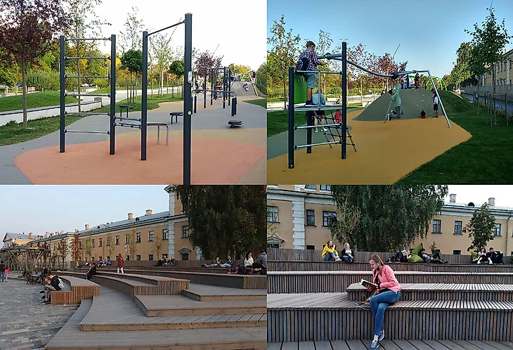 Площадка небольшая, несколько турников, но важнее место, где она находится. Территория у Петровских казарм вдоль Карповки долгое время была закрыта заборами, пока в 2017 году инициативная группа (проект «Друзья Карповки») не взялась за преобразование территории. Они провели исследование, пообщались с жителями и стейкхолдерами – и через несколько лет был спроектирован и благоустроен первый участок длинной набережной. Цель проекта – чтобы жители комфортно и интересно проводили время на набережных: устраивали пикники у воды, загорали, совершали вечерние пробежки, катались на байдарках, гуляли с семьей.