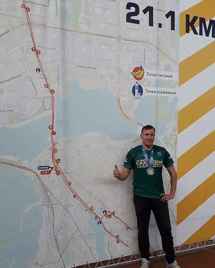 Друзья, всем доброго дня! ⠀ В 2019, после того, как первый раз пробежал "за компанию" 5ку весной, а потом 10-ку осенью, решил пробежать полумарафон и сделать это не откладывая надолго, именно в 2020 г. Думал пробежать свою первую "половинку" в мае и спокойно перейти к "пляжному волейболу". Но все помнят, что в творилось в 2020.)) Многое отменилось или перенеслось. Так и Казанский марафон перенесли на октябрь. ⠀ Да, я заявился на единственный для меня в этом сезоне забег и именно на 21.1 км. Потому что так решил еще год назад). ⠀ Ориентир на первый раз был... пробежать), но в голове держал - выбежать из 2 часов. Стартанул, встал за пейсами на 2 часа, бежал около пятерки с ними, показалось что могу быстрее и легче, пошел один - не знаю же как там будет после 15-го км. После первой десятки полет нормальный - пункт питания с водичкой, колой и апельсинами, Но думаю, ускоряться все равно не стоит - вдруг не добегу). По пути догнал группу на 1.55., Перевалило за 15 км. - на 17 км. очень вовремя пункт питания с гелями! Вот потом и понял, что он был очень вовремя). Закинулся и дальше, бежится уже тяжелее и кажется, что совсем ползу) - по скорости не понятно - бегал без трекера тогда еще. А впереди уже увидел группу на 1.50. Решил подтянуться и к ним. Понятно, что не догнал, но зато финишировал с нормальным (для себя) результатом. Пробежал за 1.51. По трассе очень весело, и поговорить и музычку послушать и красивыми видами полюбоваться - трасса для начинающих самая отличная, и для опытных, желающих показать скорость - уклонов и подъемов вообще нет практически - считается одна из самых гладких, насколько мне известно. Кстати, потом посмотрел статистику -последняя пятерка оказалась сама быстрая, хотя реально казалось, что еле плетусь). ⠀ Очень доволен, организация супер! С погодой вообще повезло - было солнечно и не жарко! Термик был лишним, надел его по неопытности). Раздевалки в тепле, разминка и отдых после забега в теплом огромном стадионе, там же и массаж после забега отличный. Трасса отличная, все в центре Казани, пунктов вода/питание много. И зрителей и поддерживающих по трассе тоже немало. В этом мае решил пробежать свой первый марафон, все там же в Казани! Сейчас уже подготовился насколько мог. С меня отчет, как пробегу. Если кому интересно!) ⠀ Вообщем отличный движ! Некоторые думают, что это скучно, я, как "игровик" со стажем, могу сказать, что мне зашел формат забегов, даже видите затянуло). Присоединяйтесь!