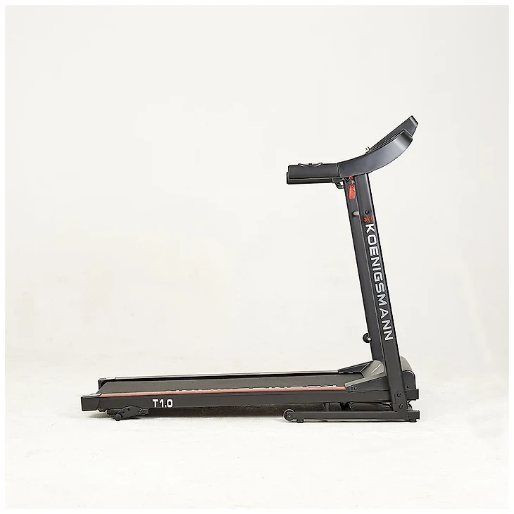 Одна из наиболее компактных моделей в нашем списке, вес всего 30 килограммов, длина 130 сантиметров, так что если ваш вес и рост сильно выше среднего, то вряд ли вам будет комфортно бежать по полотну шириной 40 сантиметров. При этом оно позволяет развить скорость до 12 километров в час, и использовать такое же количество фиксированных программ. Конструкцией предусмотрены ручки, помогающие страховать и поддерживать равновесие начинающих спортсменов, пожилых людей и нуждающихся в реабилитации. У тренажера уникальная система амортизации, шумоподавление. Koenigsmann Model T1.0 потребляет 0,7 кВт/ч, примерно так же как любой холодильник.