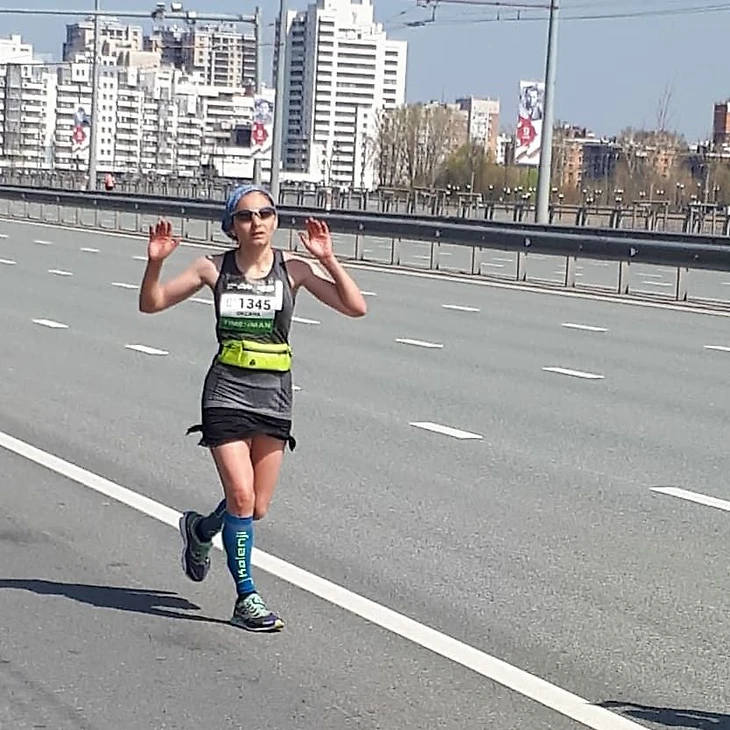 2019 год. Дочери восемь месяцев и это мои первые 42,2 км после рождения ребёнка. Тренировалась всю зиму, чтобы вернуть былую форму и просто финишировать. В результате улучшила личный рекорд на 11 минут.