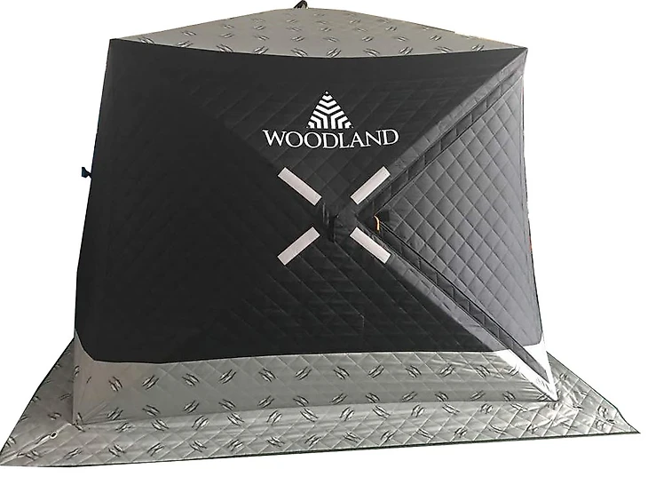 Модель WoodLand ULTRA может быть использована даже при экстремально низких температурах. Ткань довольно надежная, трехслойная с утеплителем из холлофайбера, и ей не страшен снег или ветер. У палатки два входа и одна комната. Производитель предусмотрел наличие двух вентиляционных окон и двух окон на стенах, есть внутренние карманы, куда можно поместить рыболовные принадлежности. Палатка выполнена в сером и черном цвете. Модель довольно много весит.