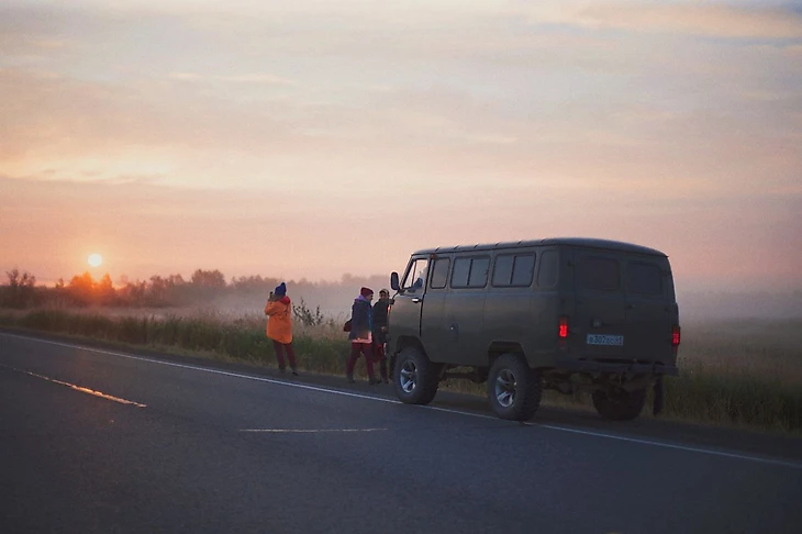На второй день был запланирован сплав на рафтах. Подъем снова в 5:30. Долгая дорога сквозь утренний туман. Есть какой-то особый кайф трястись с сонными друзьями в уазике, есть бутеры и обжигать рты горячим чаем. Встречаем рассвет из машины. Солнце, как замороженный персик, розовеет за колосьями. В туман уходит серое полотно дороги. Никого... Кажется, это один из нежнейших рассветов, что я видела в жизни.