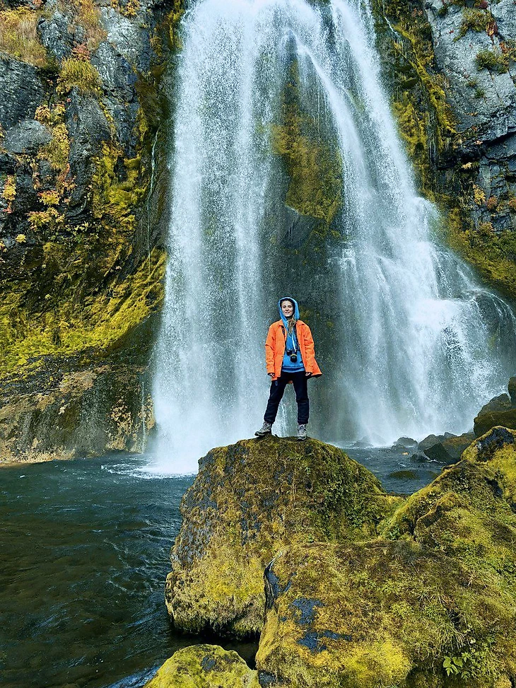 Дальше ехали по безумно красивой дороге. Вокруг вулканы, холмы, окрашенные в осень. Вышли на вершине холма и снова стали спускаться. Перед нами постепенно открывался водопад какой-то нереальной красоты. Он был уже полноводным и ревел за несколько сотен метров. Брызги, солнце, радуга, черный песок внизу и зеленый мох на камнях.