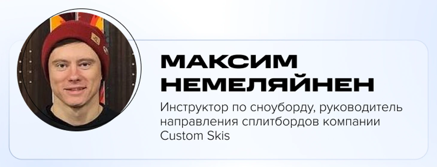 Разобраться в различиях между досками и их характеристиках, а также в особенностях подбора сноуборда под конкретные условия катания нам поможет сертифицированный инструктор по сноуборду и руководитель направления сплитбордов компании Custom Skis Максим Немеляйнен.
