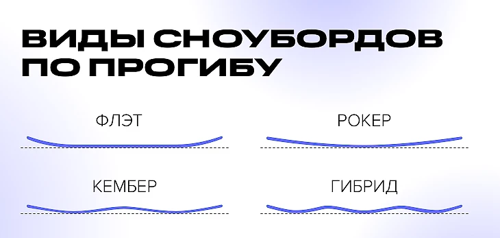 Сноуборд может не иметь прогиба (флэт-доски), иметь классический прогиб (кембер), обратный прогиб (рокер) или быть гибридом (совмещать разные прогибы).