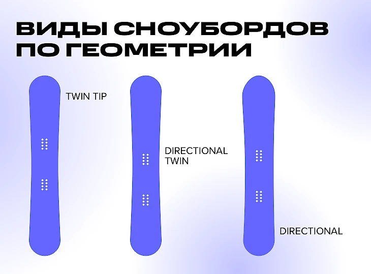 По форме доски бывают трех видов – направленные (directional), полностью симметричные (twin-tip или true-twin) и симметричные с направленной жесткостью (directional-twin).