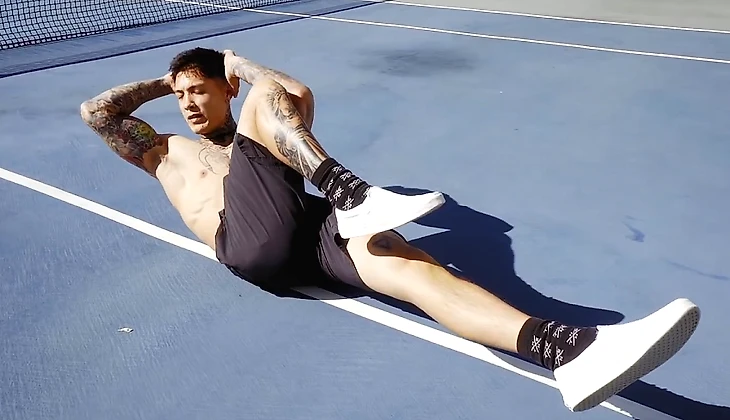Примите упор лежа как при отжиманиях. Теперь поочередно выполняйте касание рукой противоположного плеча, затем – бока, потом – колена, в завершении – ступни. Это один полный повтор.