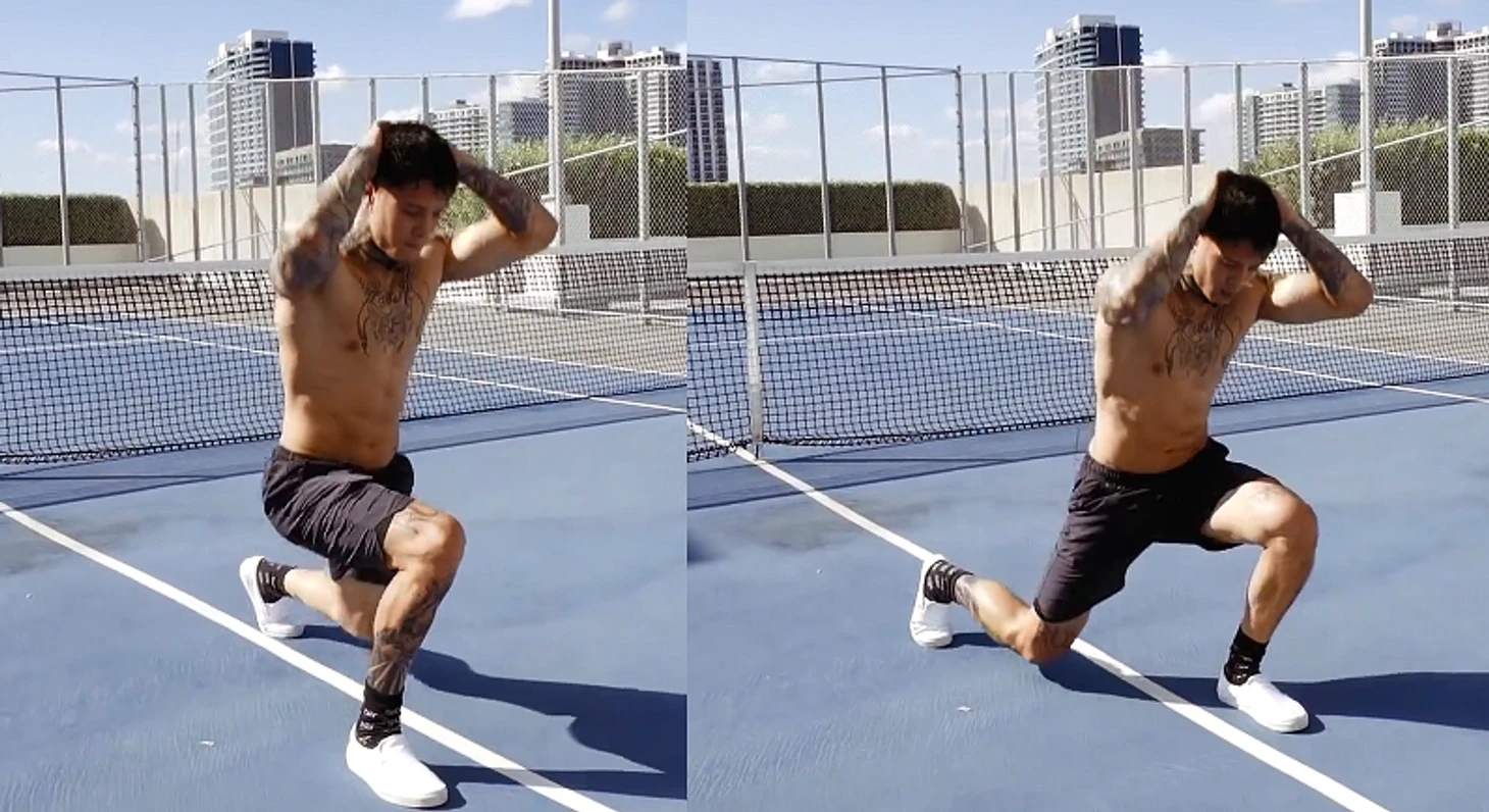 Примите положение выпада: одна нога вынесена вперед, другая – назад. Колени согнуты под углом 90°, руки на голове. Теперь поменяйте ноги местами через выпрыгивание. Делайте попеременные прыжки в течение 30 секунд.
