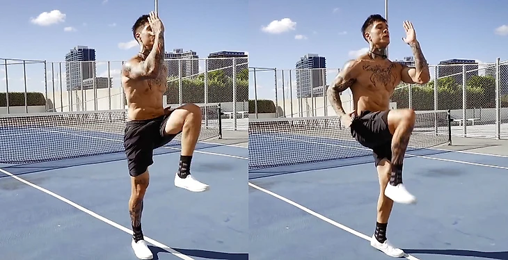 Выполняйте бег на месте, поднимая колено, пока бедро не станет параллельно полу. Помогайте себе руками, задавая амплитуду и ритм.