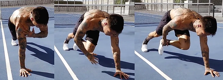 Встаньте в упор лежа как при отжиманиях. Прыжком поднесите ноги к себе, а затем верните их в исходное положение. Теперь в упоре лежа прыжком разведите и сведите ноги. Повторяйте фазы одну за другой.