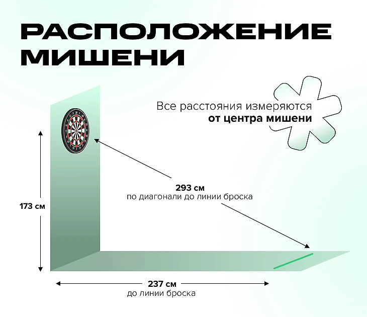 Расстояние от мишени до рубежа, с которого следует бросок – ровно 237 сантиметров. Проверить правильность расчетов можно при помощи геометрии. Если представить прямоугольный треугольник, в котором катеты – это расстояния от пола до мишени и от мишени до рубежа, то гипотенуза (расстояние от центра мишени до рубежа по прямой) должна составлять 293 сантиметра. Проверьте – если у вас получилась эта цифра, то вы повесили мишень правильно.