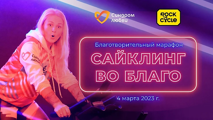 4 марта в московской сайкл-студии Rock the Cycle (Центральный Детский Магазин) состоится весенний благотворительный марафон «САЙКЛИНГ ВО БЛАГО». В этом году марафон приурочен ко Дню людей с синдромом Дауна, который отмечается ежегодно во всем мире 21 марта. Цель марафона – собрать 400 000 рублей на образовательные и развивающие программы для людей с синдромом Дауна.