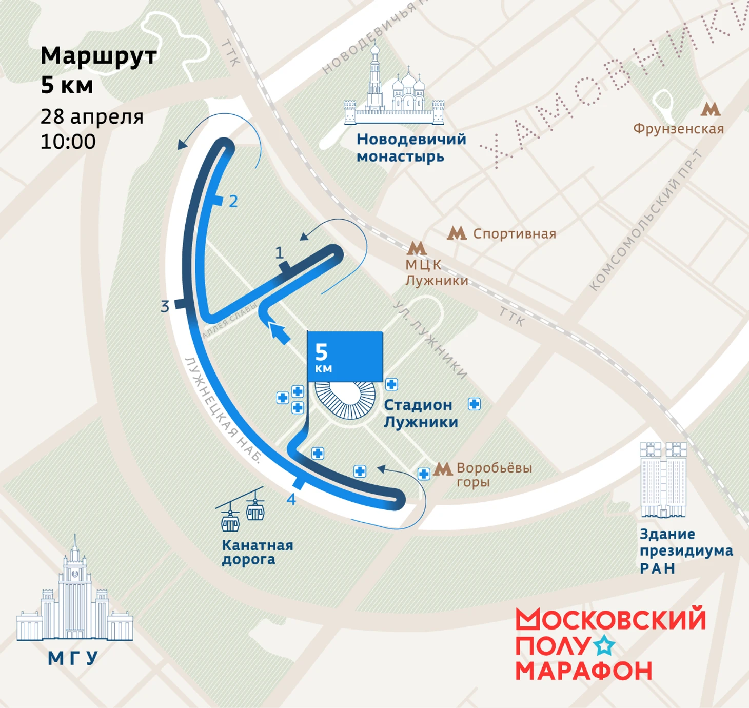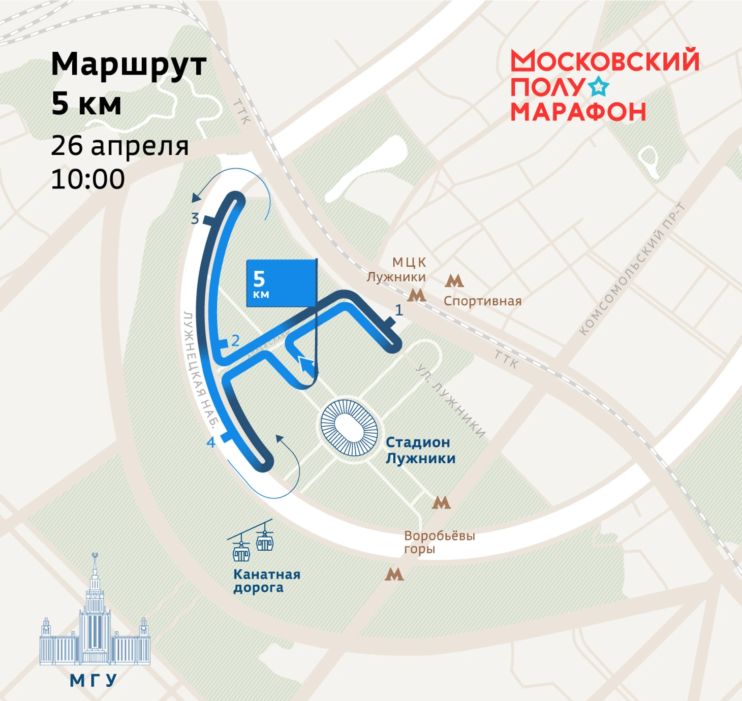 В 2025 году Московский полумарафон пройдет по новому маршруту. Старт теперь будет на Университетской площади, напротив главного здания Московского государственного университета (МГУ имени М.В. Ломоносова), а финиш – внутри Большой спортивной арены «Лужники».