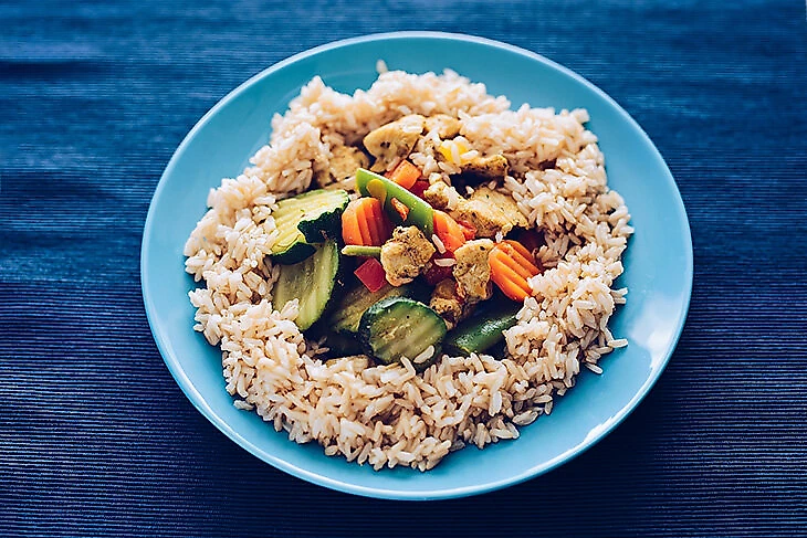 Бурый рис – отличный гарнир к куриному мясу. При этом стоит учесть, что бурый рис готовится дольше белого.